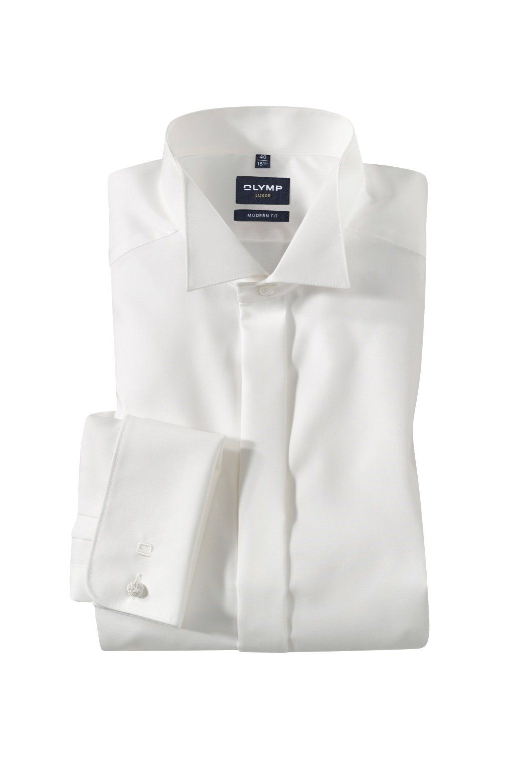 Fraková pánská košile OLYMP Luxor Soirée ve střihu Modern Fit s prodlouženým rukávem (69 cm) nabízí dokonale čistý formální vzhled díky kryté léze, frakovému límečku a dvojité manžetě na manžetové knoflíčky. Ideální na ples, svatbu i další slavnostní příležitosti pro muže, kteří potřebují delší rukáv.