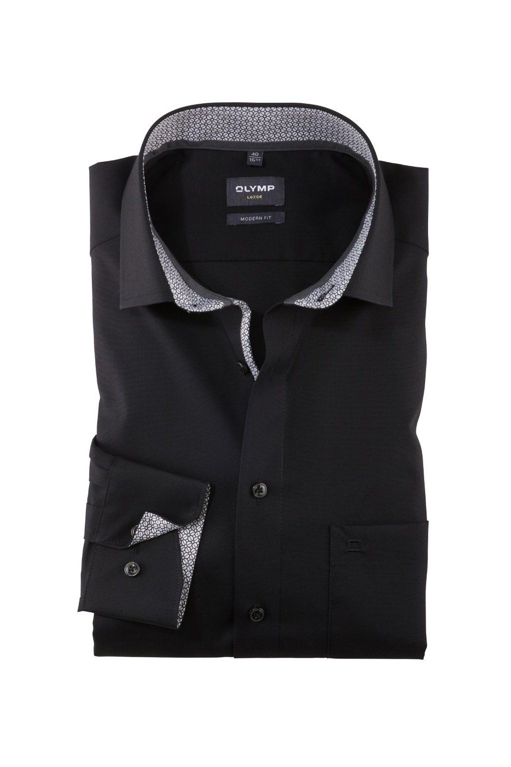Pánská košile OLYMP Luxor ve střihu Modern Fit s dlouhým rukávem nabízí čistý, elegantní vzhled doplněný kontrastními detaily v límečku a manžetách a tmavými knoflíky. 100% bavlna je prodyšná, náprsní kapsa praktická a nežehlivá úprava zajistí upravený vzhled po celý den.