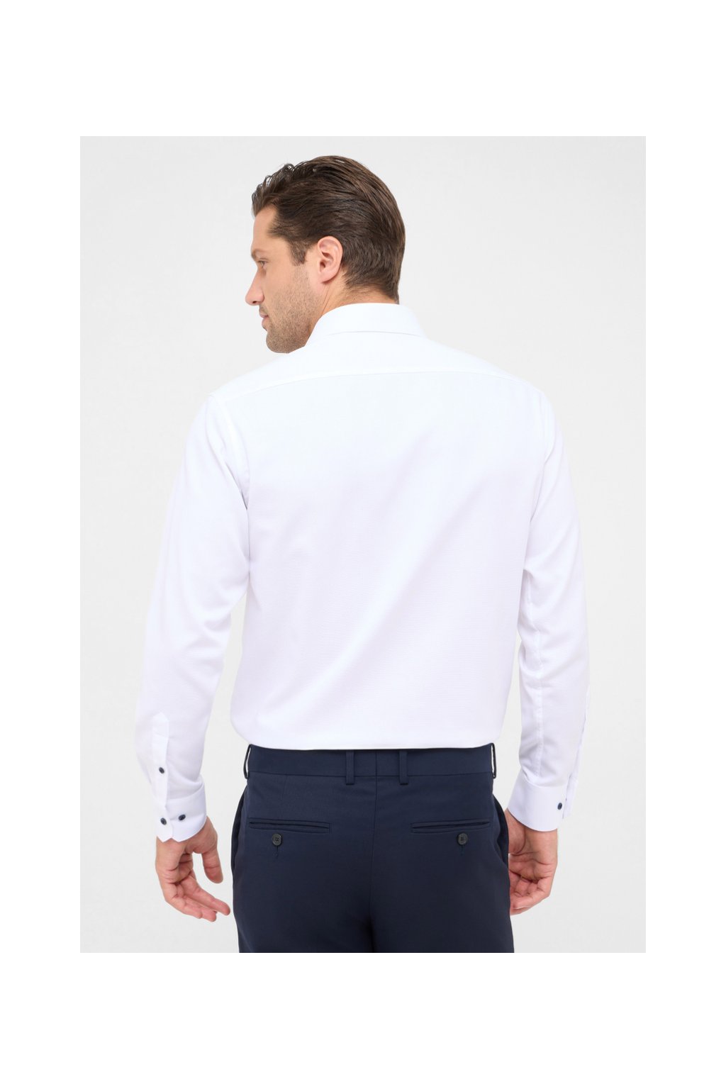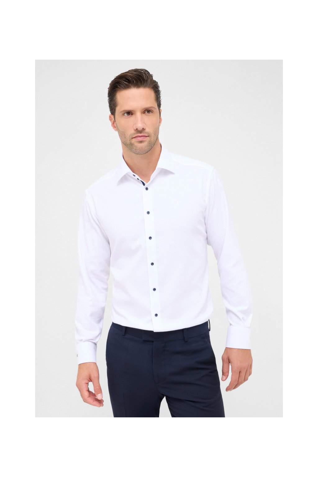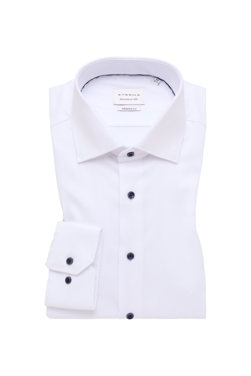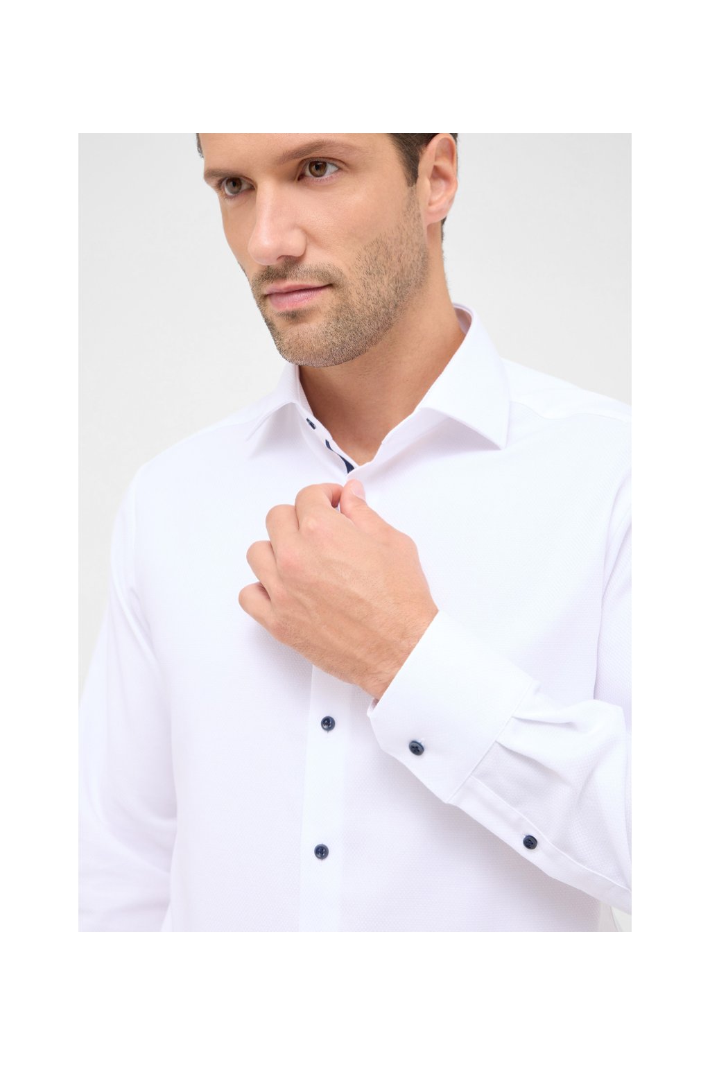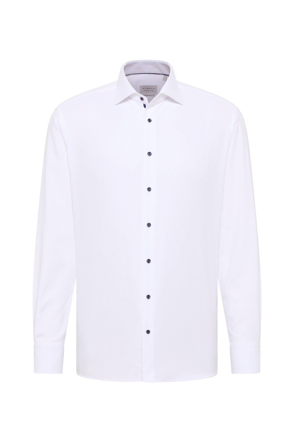 Elegantní bílá nežehlivá košile Eterna s jemnou strukturou a tmavě modrými knoflíčky zaujme na první pohled. Modern Fit střih bez kapsy padne běžné i robustnější postavě. 100% bavlna s nežehlivou úpravou zaručuje pohodlí bez starostí. Ideální do kanceláře, na schůzky i slavnostní chvíle.