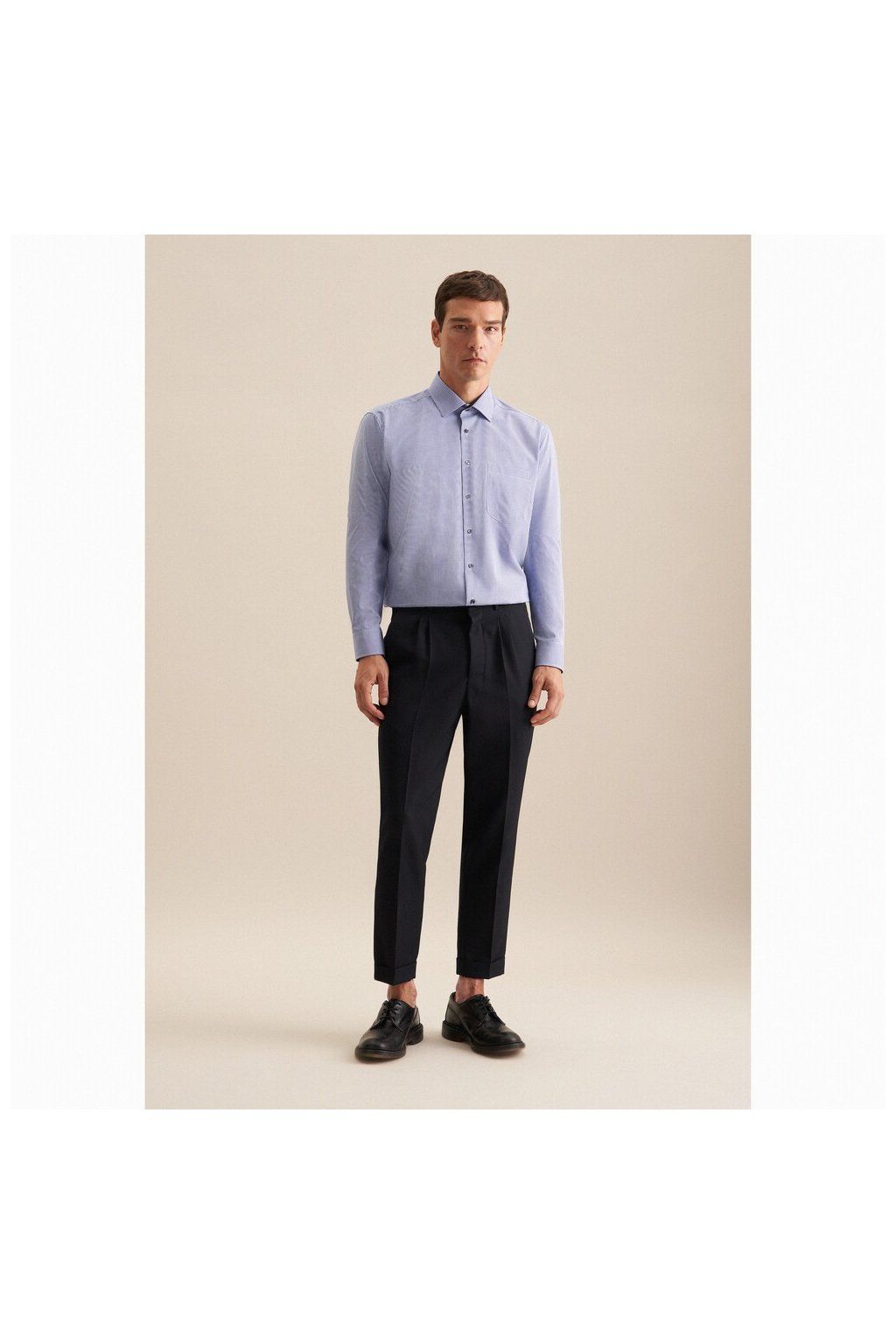 Klasický Kent límeček zajišťuje univerzální využití – snadno ji vezme do práce, na schůzku i na večeři. Je to košile, která funguje ve chvílích, kdy chce vypadat dobře bez zbytečné námahy.