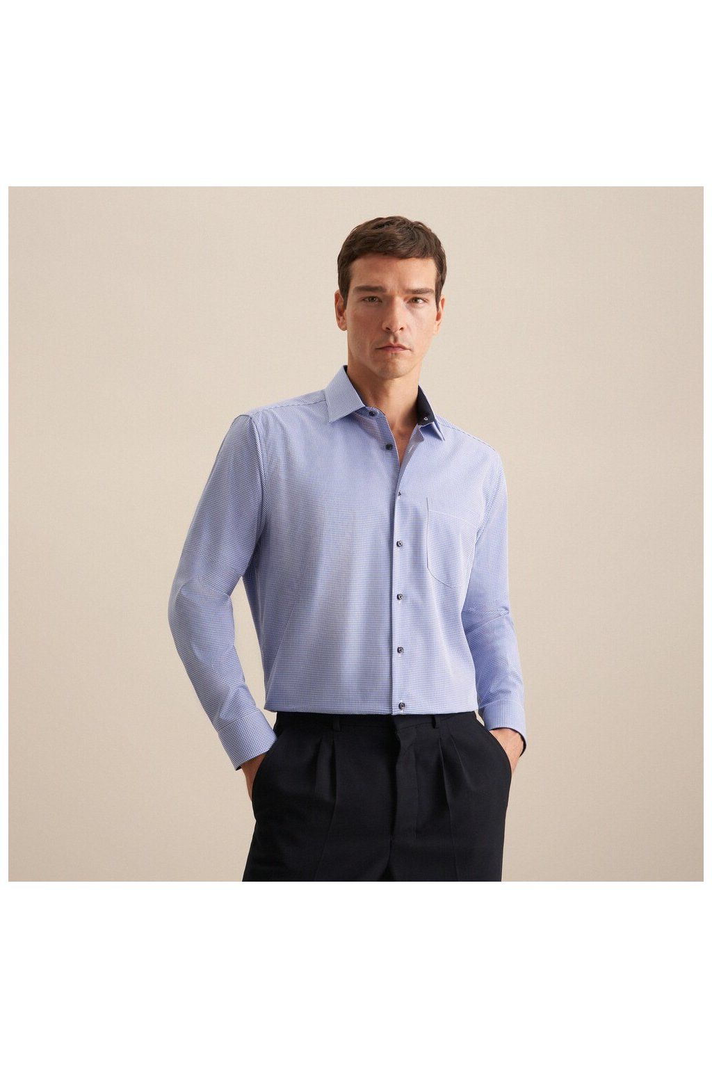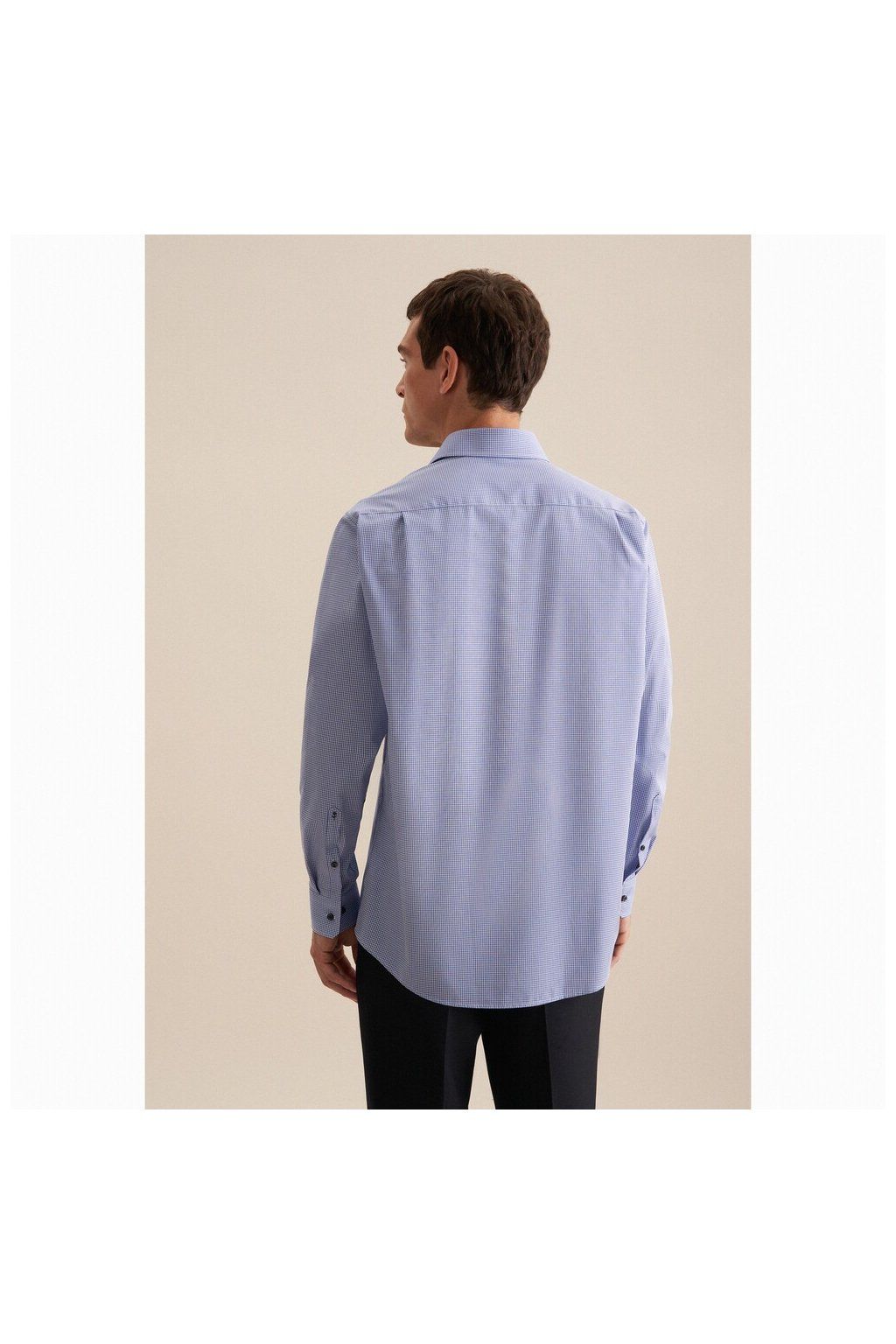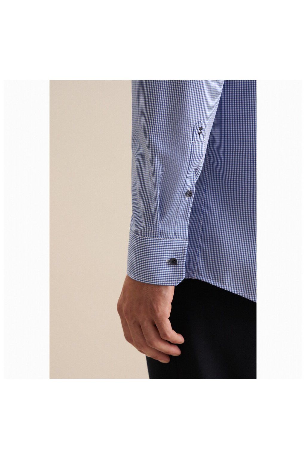 Jemná kostička dodává košili strukturu a lehkost, aniž by působila rušivě. Na dálku vypadá čistě a elegantně, zblízka odhalí detail, který ji posouvá o úroveň výš.