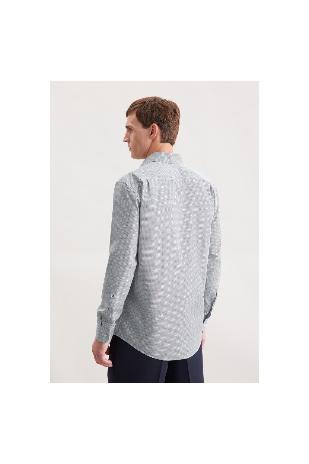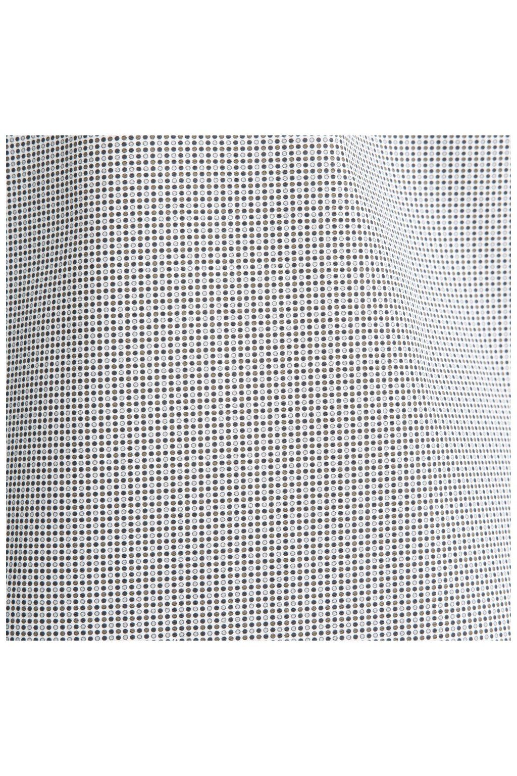 Pravidelný motiv drobných bodů vytváří zajímavý vizuální efekt – z dálky košile působí decentně, zblízka vynikne detail, který jí dodává osobitost. Je to přesně ten typ vzoru, který upoutá, ale nepřebije celý outfit. Košile je vyrobena ze 100% bavlny s nežehlivou úpravou, takže si drží upravený vzhled po celý den bez nutnosti žehlení. Je kvalitní, příjemná na nošení a ideální pro každodenní využití.
