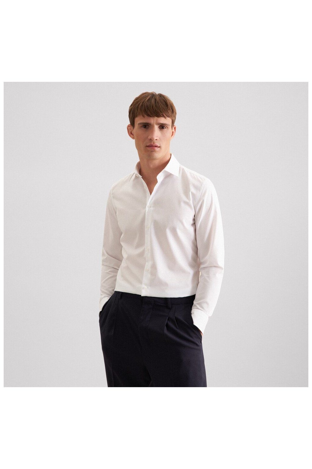 Klasický Kent límeček patří mezi nejoblíbenější varianty – snadno ho sladíte s kravatou i bez ní. Košile nemá náprsní kapsu, takže působí čistě a nadčasově.