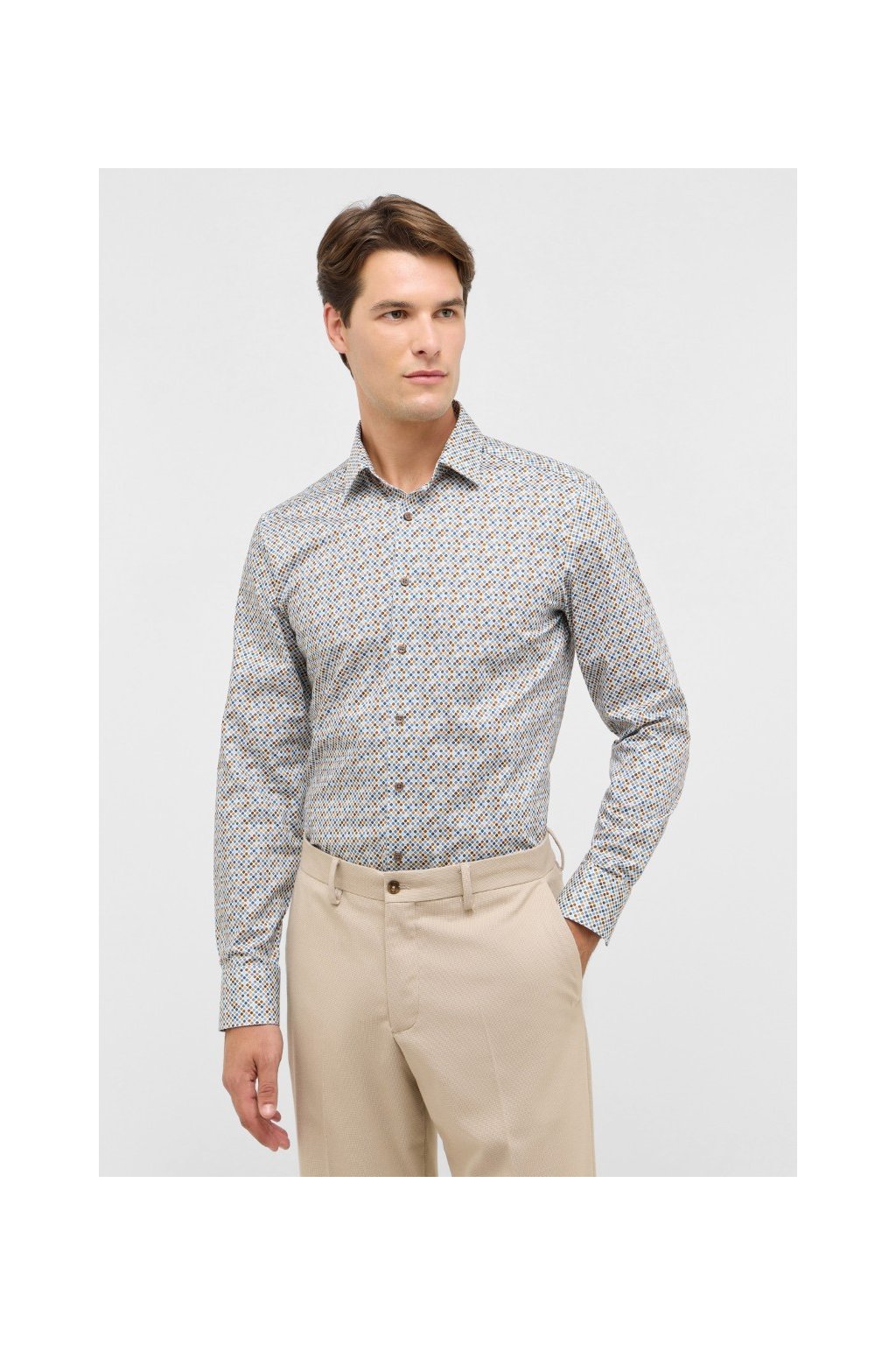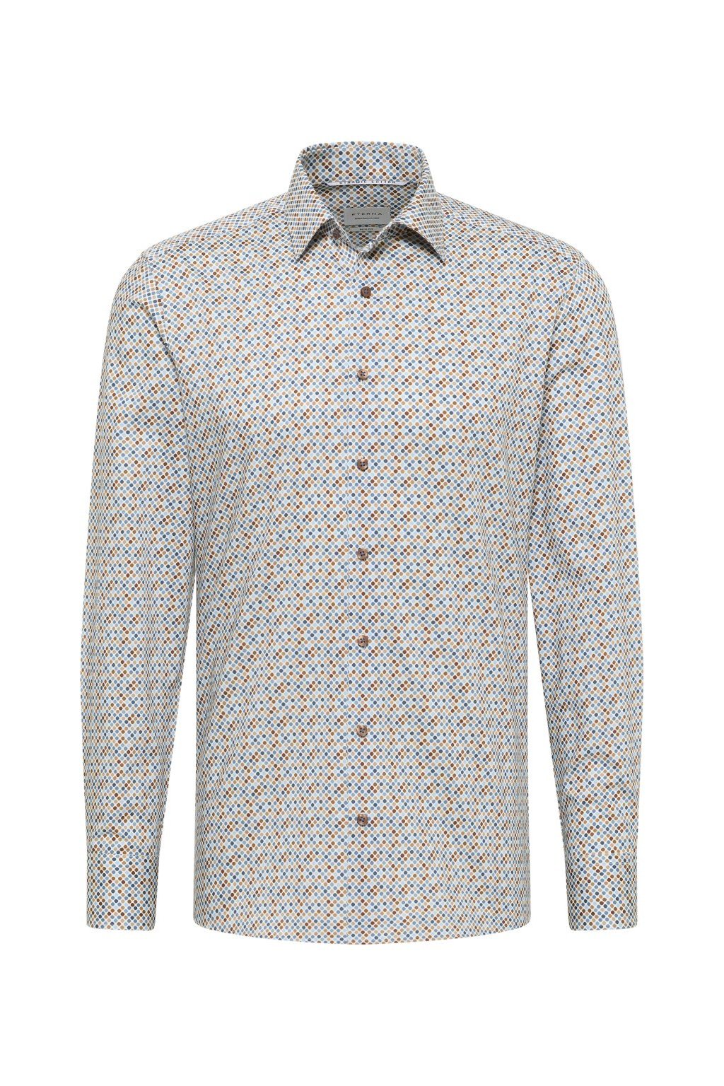 Pánská slim fit košile Eterna z bavlny Dynamic Cotton s nežehlivou úpravou nabízí hravý puntíkový vzor v modro-hnědých tónech, elegantní střih a maximální komfort při nošení.