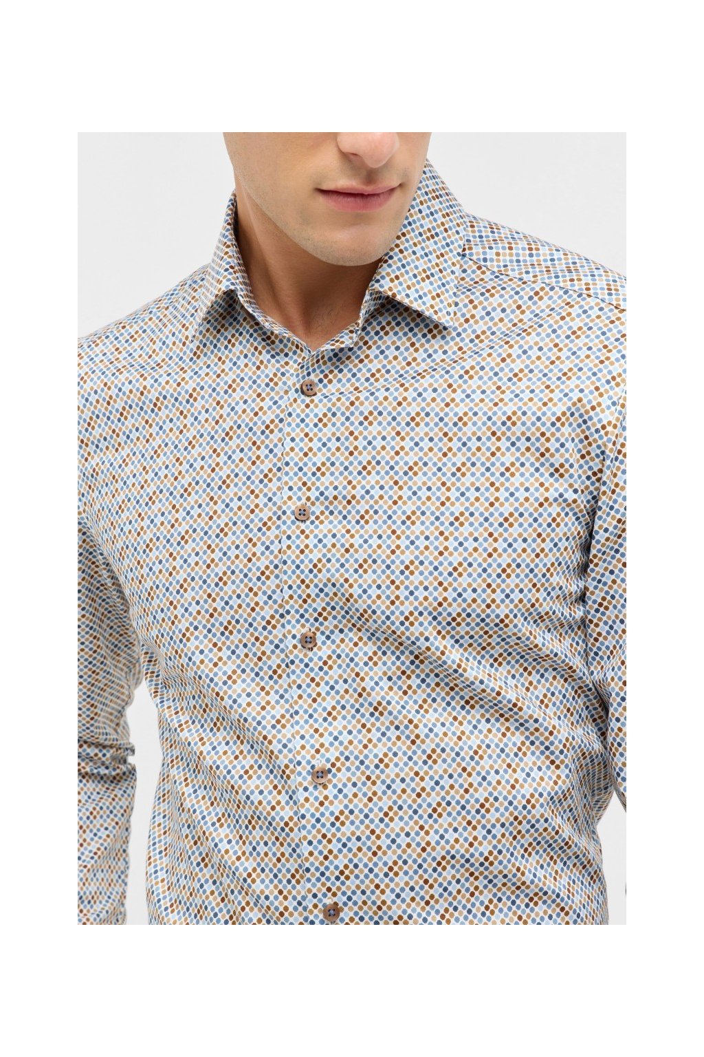 Tahle pánská košile značky Eterna dokazuje, že i hravý vzor může působit elegantně. Slim fit střih bez náprsní kapsy, klasický límeček Kent a barevné puntíky v odstínech moderní modré a hnědé, které ladí s decentními hnědými knoflíky, vytváří originální, ale stále vkusný vzhled.
