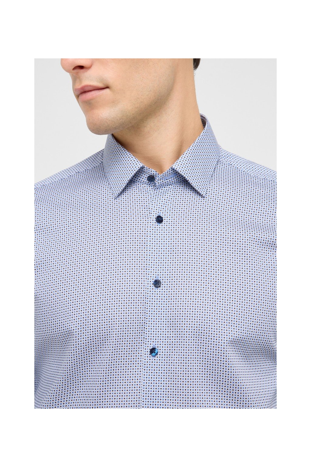 Elegantní pánská košile Eterna Slim Fit s extra prodlouženým rukávem 70 cm. Nežehlivá 100% bavlna, jemný drobný vzor a Kent límeček bez kapsy. Skvělá do práce i na společenské události.
