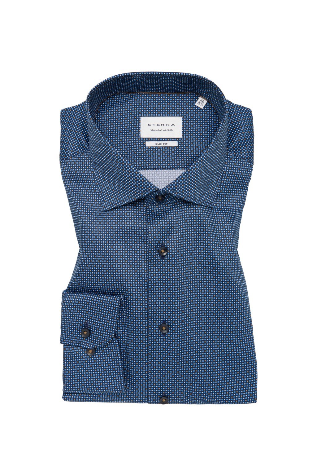 Elegantní pánská košile Eterna Slim Fit s extra prodlouženým rukávem 70 cm. Nežehlivá 100% bavlna, jemný drobný vzor a Kent límeček bez kapsy. Skvělá do práce i na společenské události.