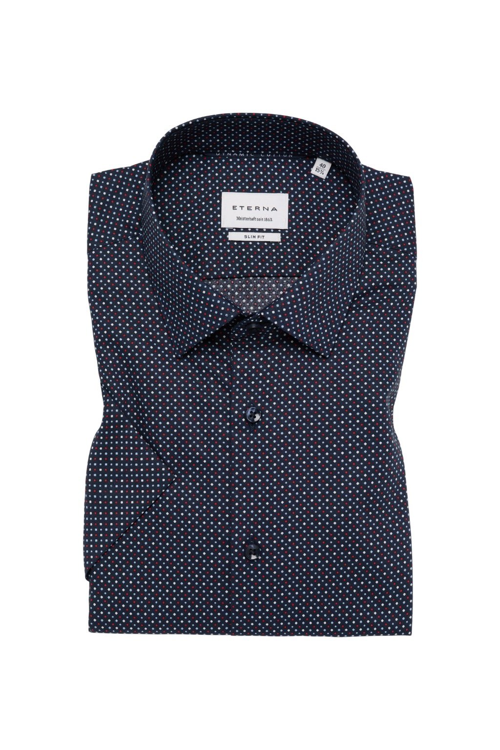 Pánská košile Eterna Slim Fit v tmavě modré barvě zaujme jemným vzorem drobných puntíků v bílé a červené barvě. Tento detail dodává košili moderní a svěží charakter, který oživí každý outfit, aniž by působil příliš výrazně. Díky tomu je ideální jak do kanceláře, tak pro volnočasové příležitosti.