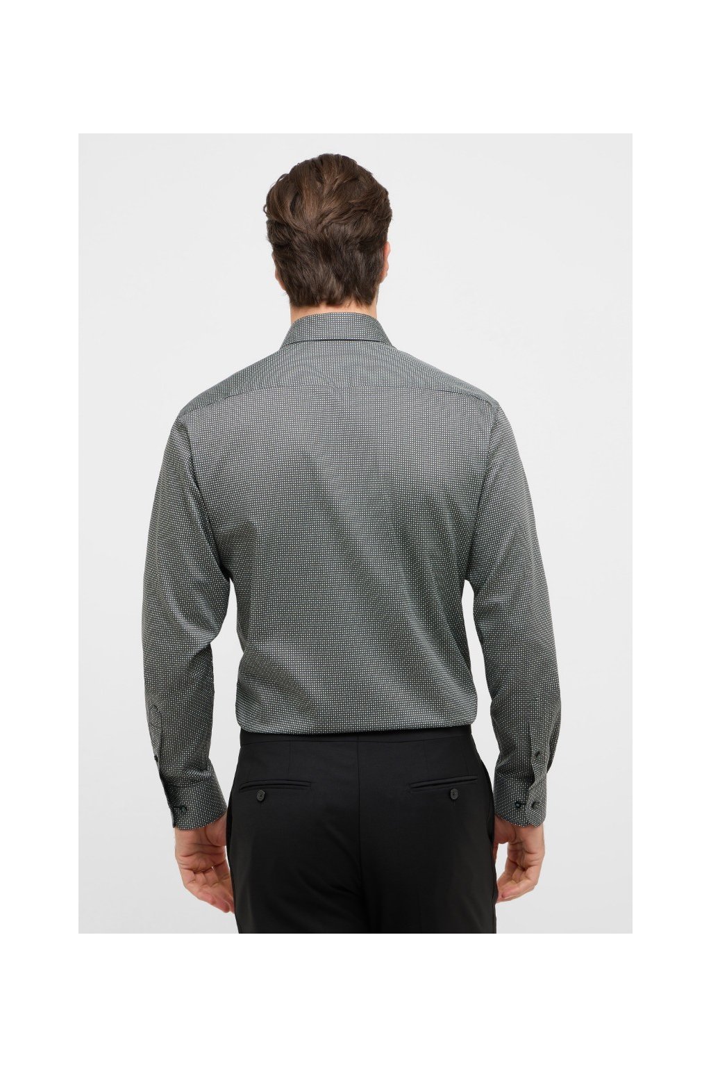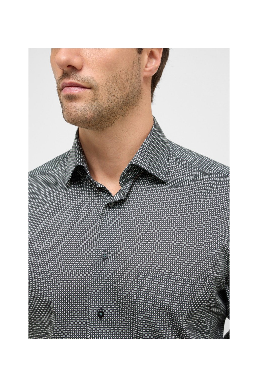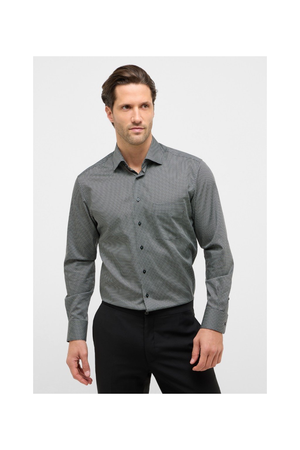 Elegantní pánská košile Eterna Slim Fit s dlouhým rukávem 67 cm. Nežehlivá 100% bavlna, jemný drobný vzor a Kent límeček bez kapsy. Skvělá do práce i na společenské události. Košile je bez náprsní kapsy - foto jiného střihu.