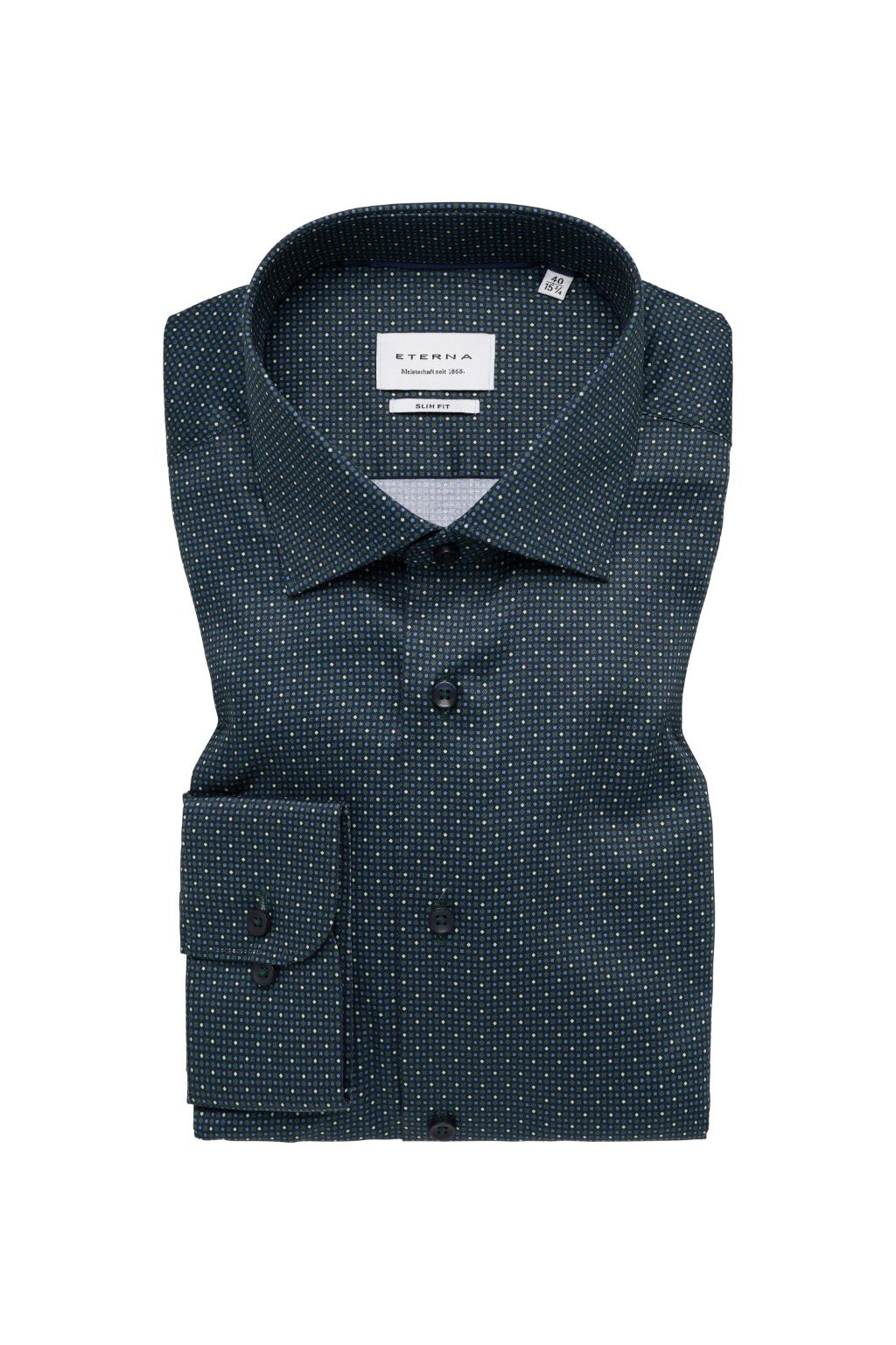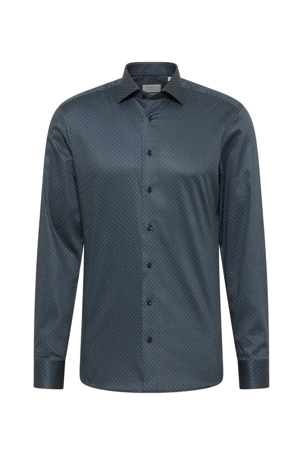 Elegantní pánská košile Eterna Slim Fit s dlouhým rukávem 67 cm. Nežehlivá 100% bavlna, jemný drobný vzor a Kent límeček bez kapsy. Skvělá do práce i na společenské události.