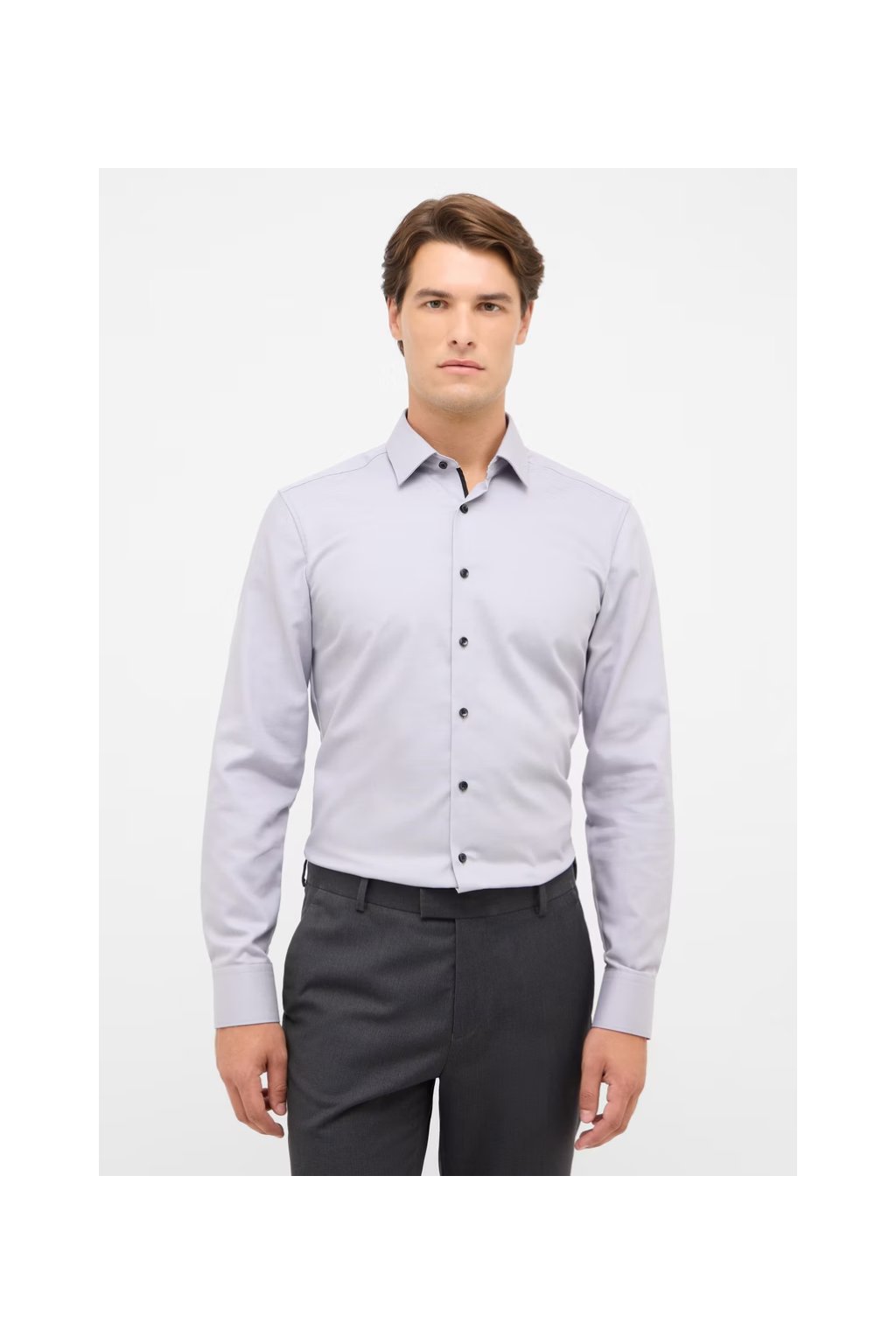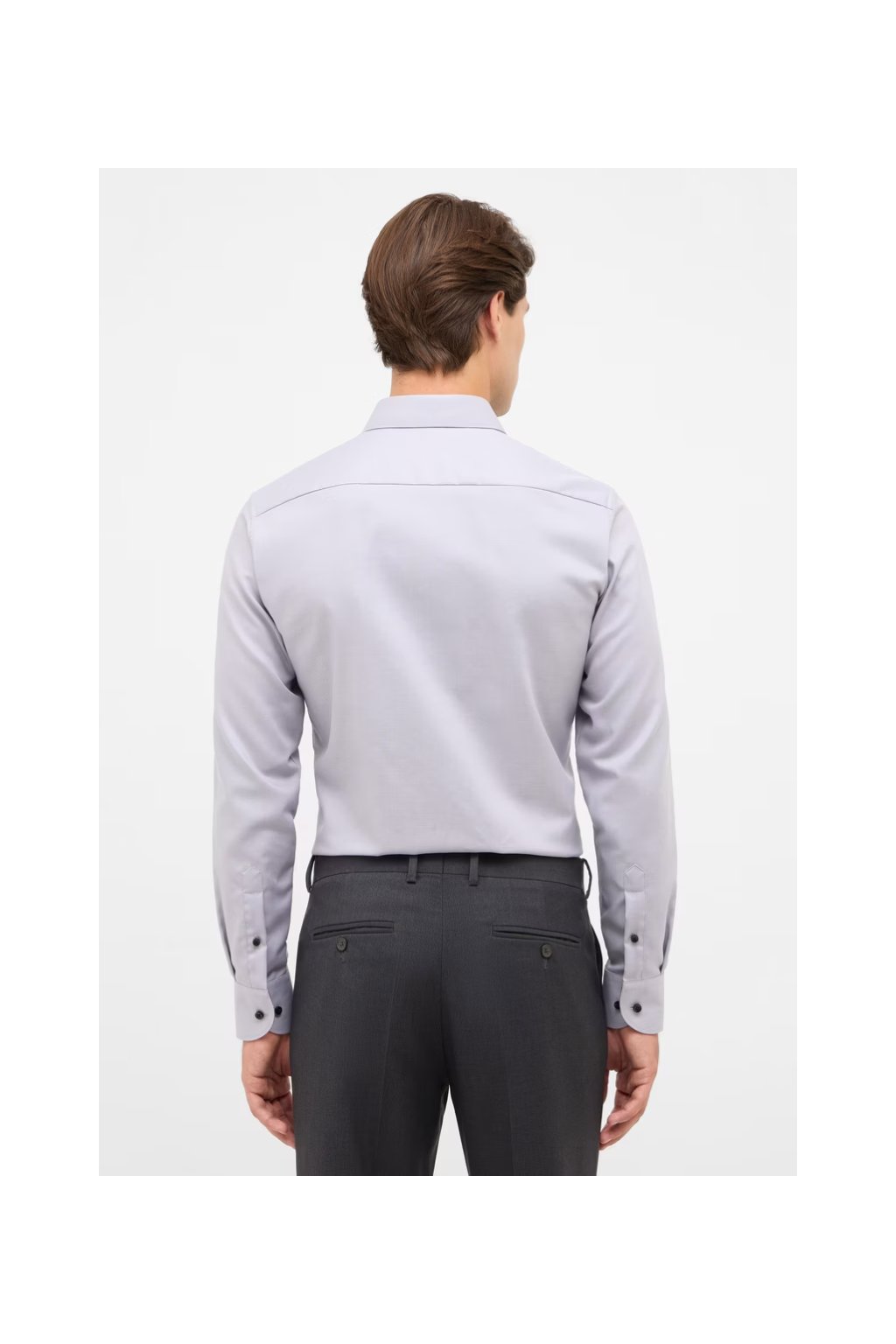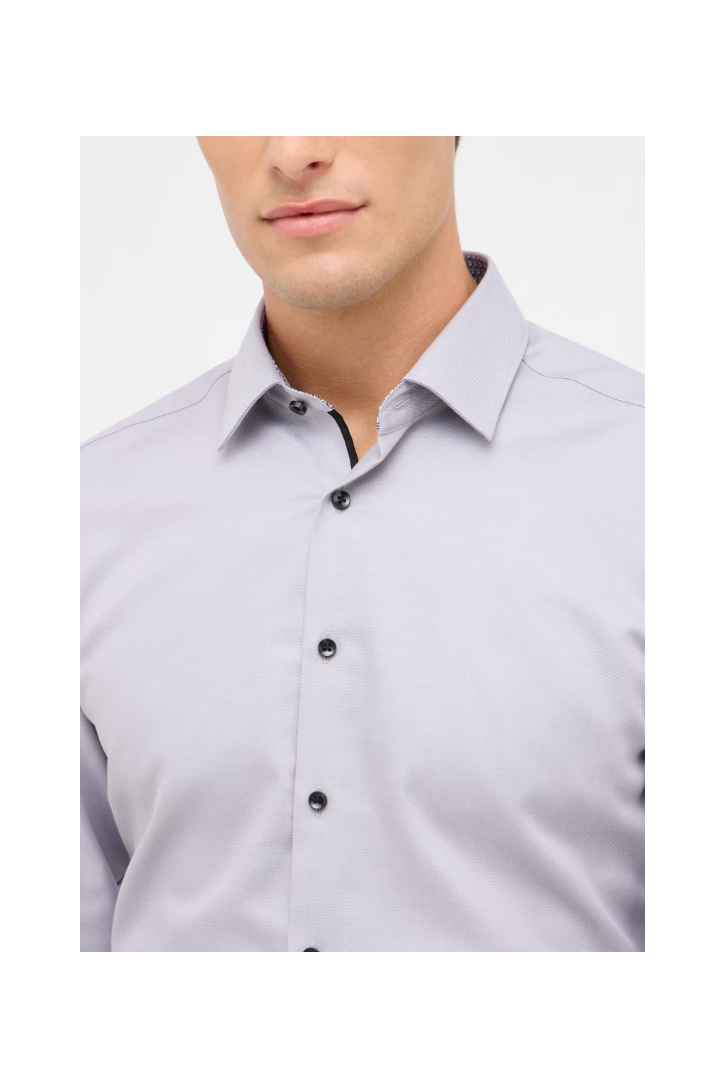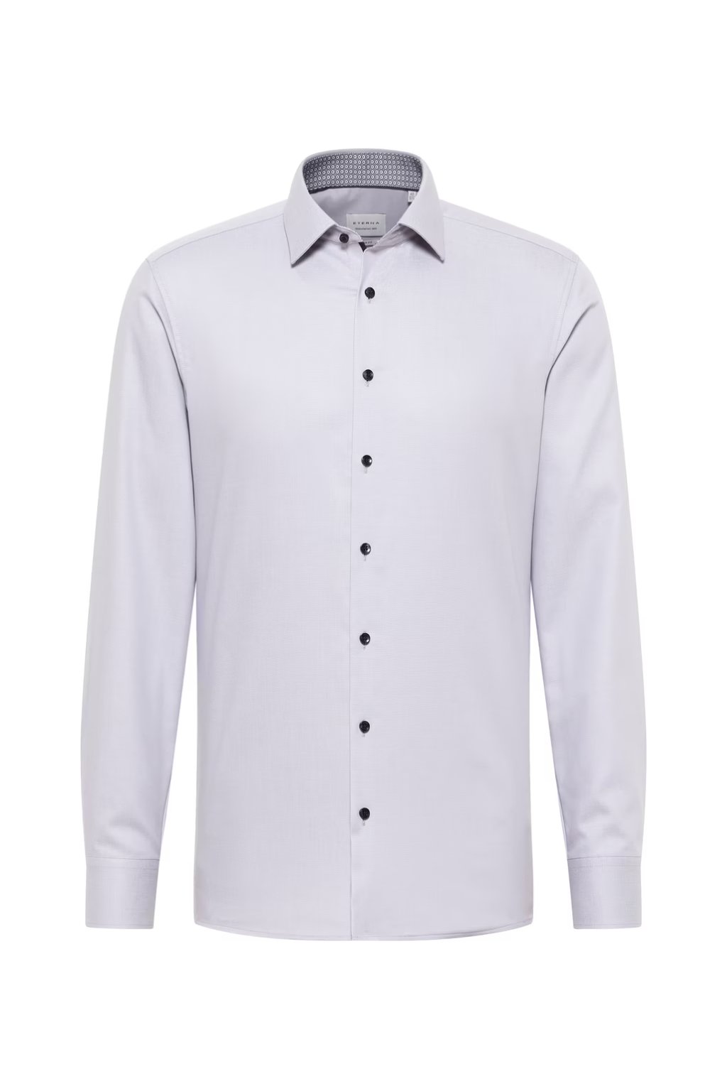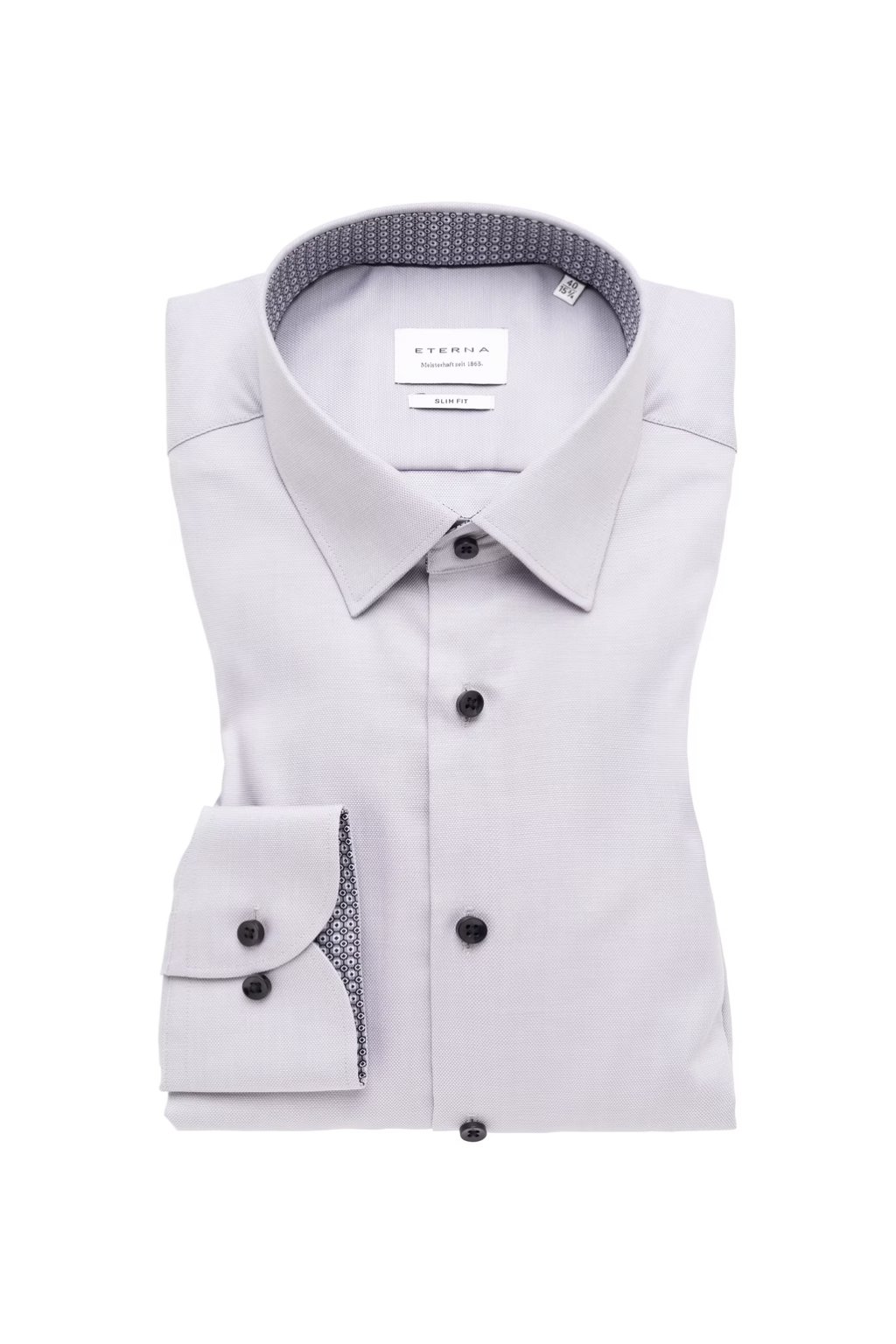 Pánská košile Eterna Slim Fit ze 100% nežehlivé bavlny ve světle šedé barvě. Tmavé knoflíky a vzorované vnitřní detaily dodávají styl. Elegantní volba bez náprsní kapsy – ideální pro práci i volný čas.