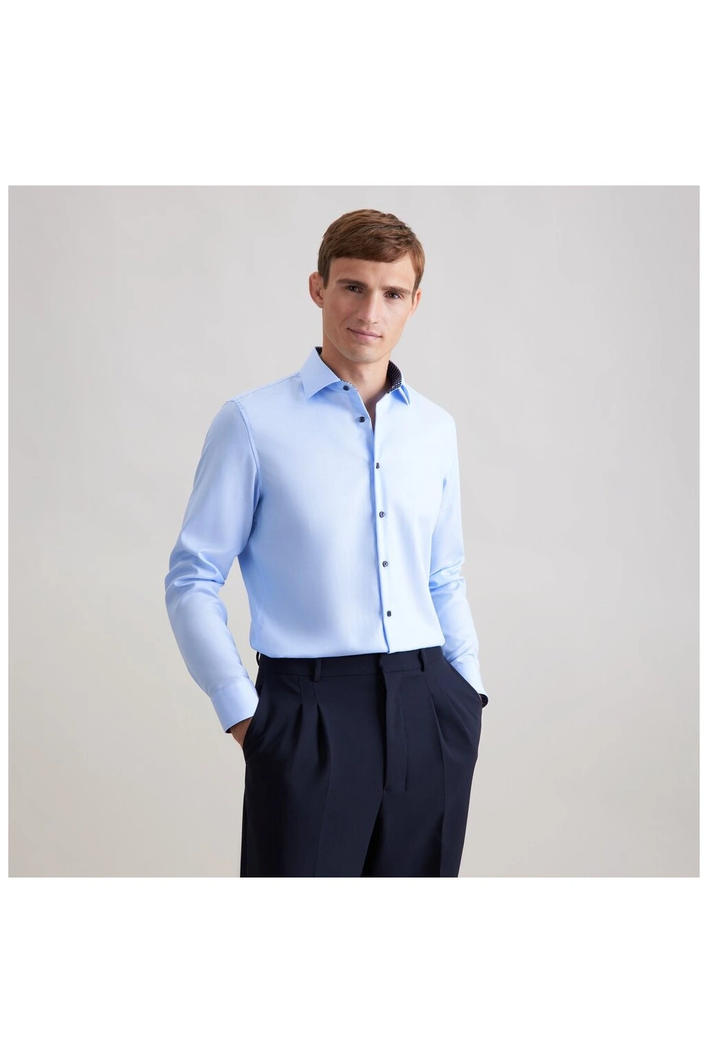 Světle modrá je skvělou alternativou k bílé – je stejně univerzální, ale působí uvolněněji a moderněji. Kontrastní detail uvnitř límce a manžet dodává košili zajímavý prvek, který vynikne při každém pohybu. Slim Fit střih krásně sedí a zvýrazní postavu. 100% bavlna s nežehlivou úpravou zajistí, že košile bude vypadat skvěle od rána do večera bez zbytečné námahy.
