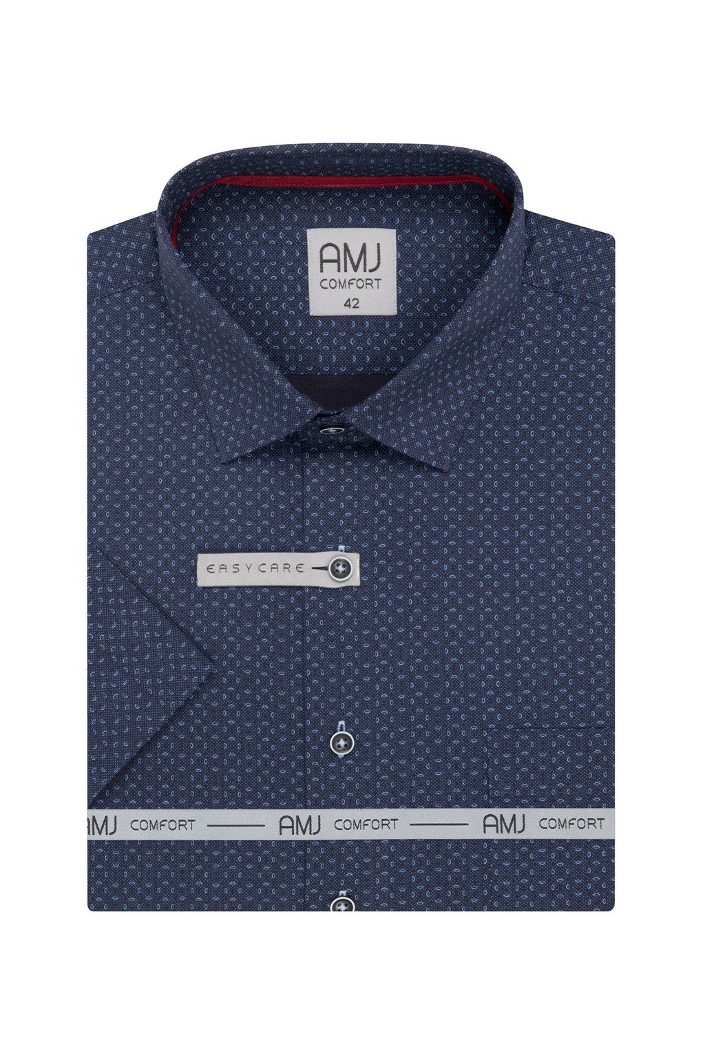 Pánská vzorovaná košile AMJ s krátkým rukávem v proštíhleném střihu Slim Fit. Letní klasika s decentním vzorem. Celkový dojem umocňuje nadčasový límeček Kent. Moderní nádech získává košile díky absenci náprsní kapsy. Tato košile Vás nadchne nejen svým složením (95 % bavlny a 5 % spandexu), ale i easy-care úpravou pro snadné žehlení. Oblíbené české košile.