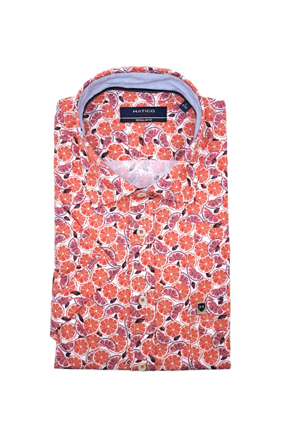 Volnočasová pánská košile s výrazným letním vzorem korálových citrónů na bílém podkladu. 100% bavlna s Easy Care úpravou, Regular Fit střih, Kent límec, náprsní kapsa s logem Hatico.
