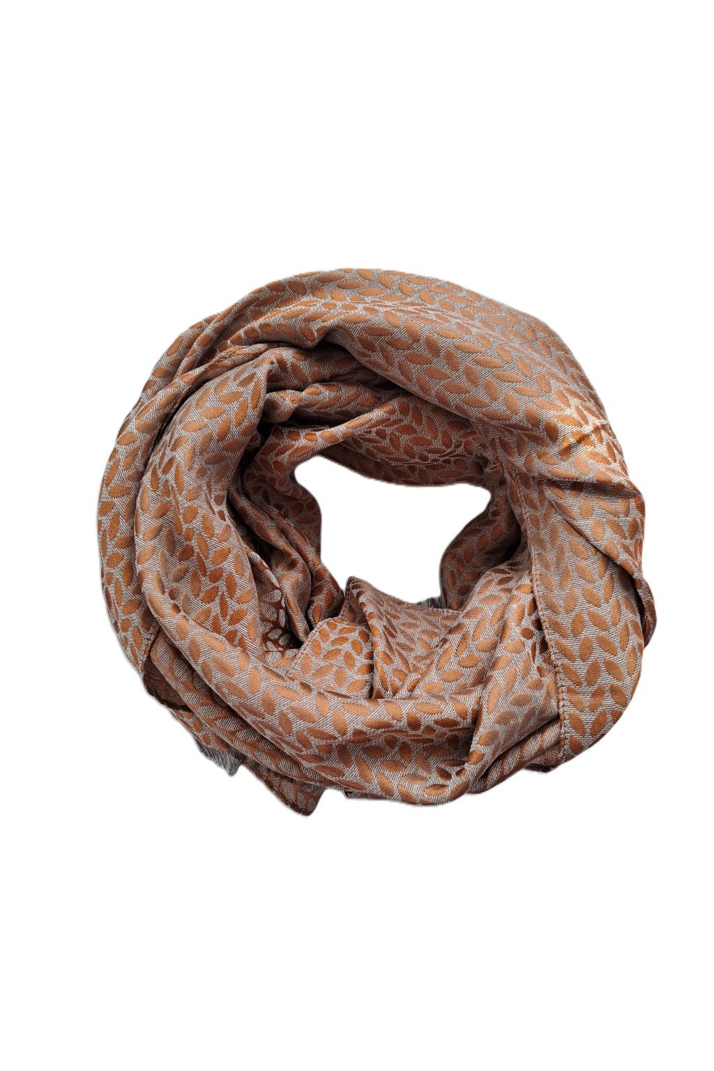 Luxusní italská šála v hřejivých odstínech měděné a béžové barvy. Kombinace vlny, hedvábí a kašmíru jí dodává výjimečnou hebkost, eleganci a podzimní kouzlo.