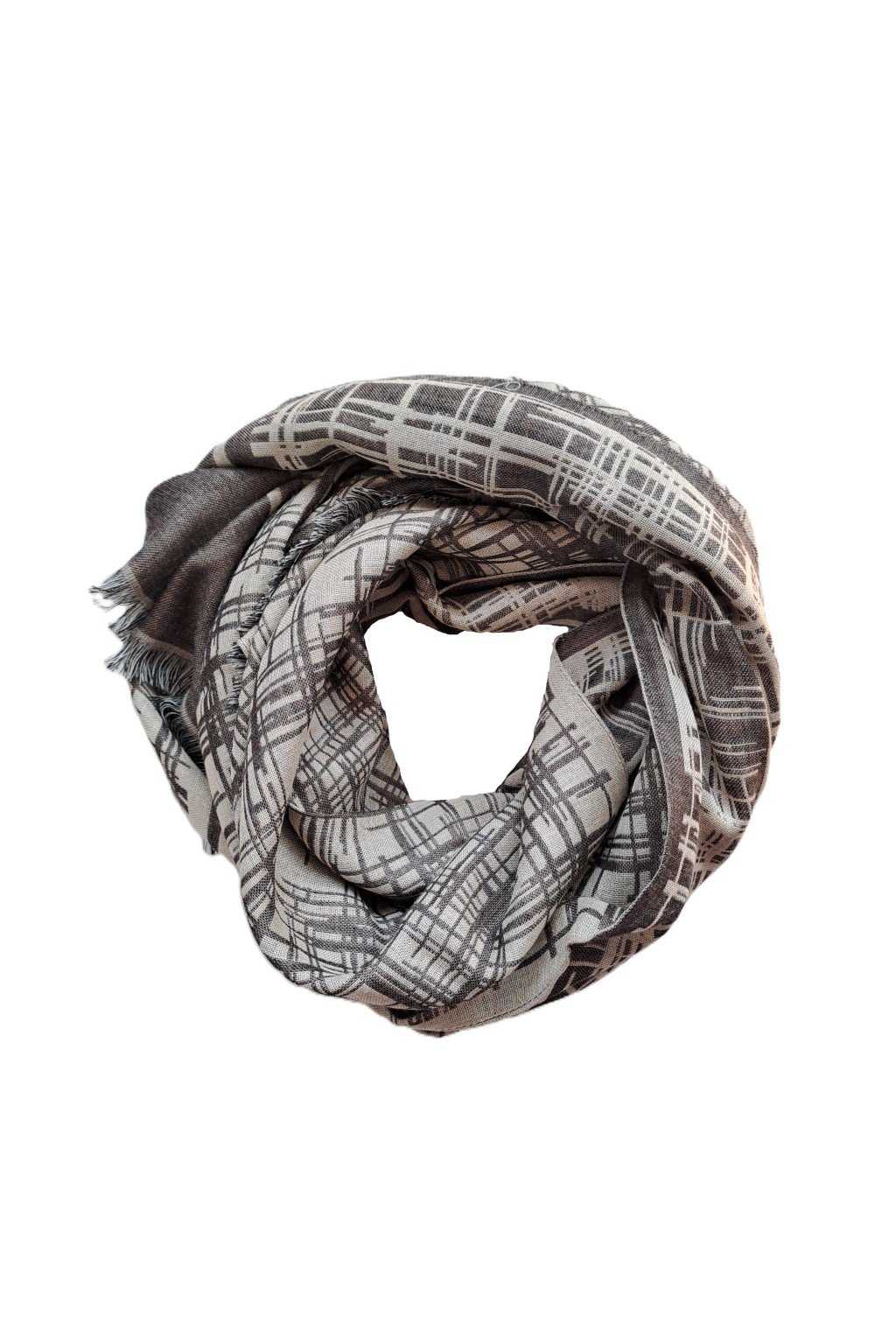 Unisex šála v elegantních hnědo-béžových tónech. Kombinace vlny, hedvábí a kašmíru zaručuje jemnost, hřejivost i luxusní vzhled. Rozměr 56 × 180 cm.