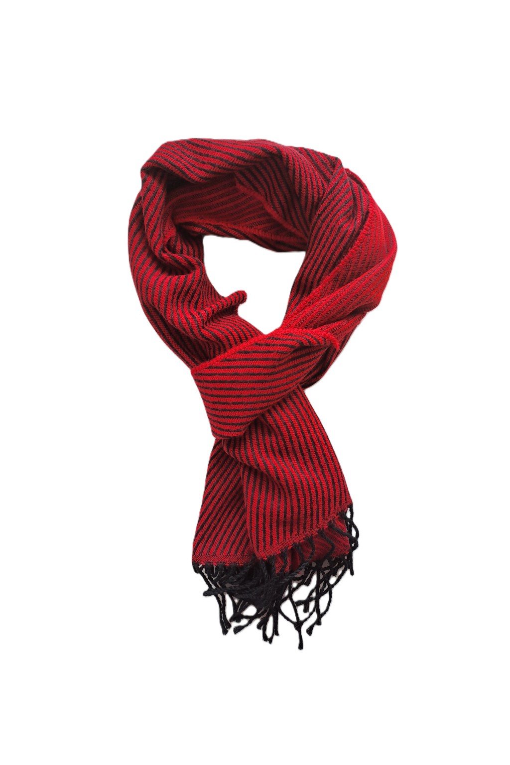 Stylová italská šála ze 100% vlny v elegantní kombinaci červené s černými proužky. Lehká, hřejivá a ideální na podzim i zimu.