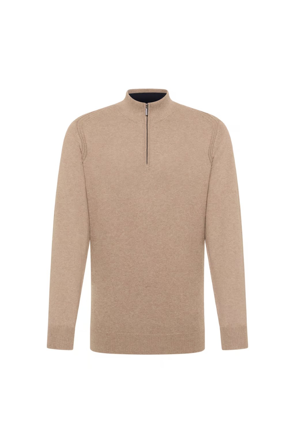 Pánský luxusní svetr z bavlny a kašmíru s krátkým zipem - béžový