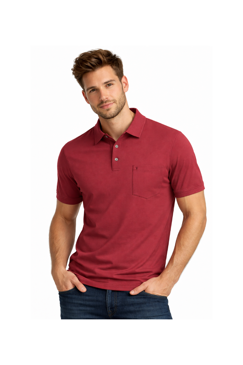 Praktickým a stylovým detailem je náprsní kapsička s vyšitým písmenem „V“, která dodává tričku decentní charakter a lehce sportovní eleganci. Límec a zapínání na knoflíčky podtrhují klasický polo styl.