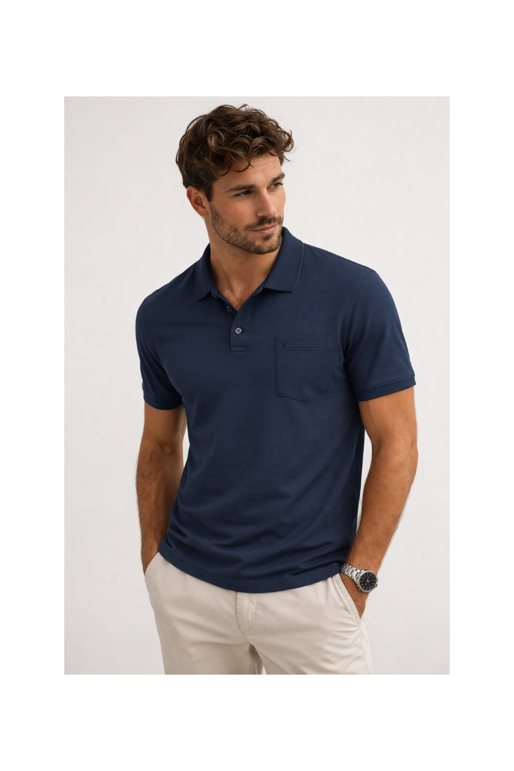 Praktickým a stylovým detailem je náprsní kapsička s vyšitým písmenem „V“, která dodává tričku decentní charakter a lehce sportovní eleganci. Límec a zapínání na knoflíčky podtrhují klasický polo styl.