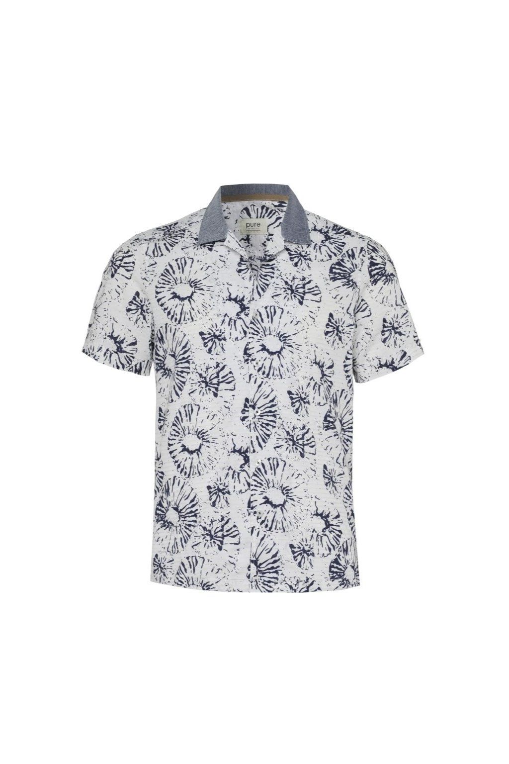 Pánská letní košile PURE s krátkým rukávem v casual střihu z 90 % bavlny a 10 % lnu. Lehká, prodyšná, s rozhaleným límcem a originálním vzorem. Ideální na dovolenou i volný čas.